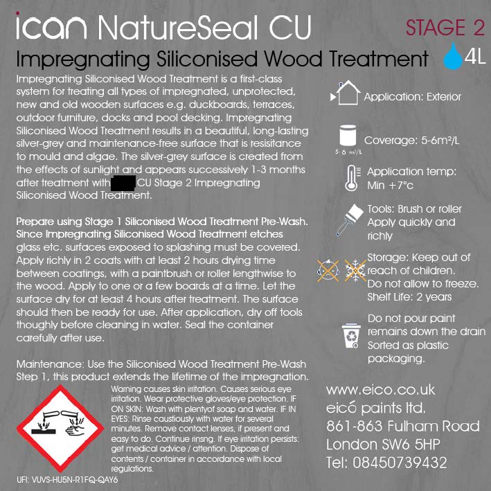 Impregnating Siliconised Wood Treatment is a first-class system for treating all types of impregnated, unprotected, new and old wooden surfaces e.g. duckboards, terraces, outdoor furniture, docks and pool decking. Impregnating Siliconised Wood Treatment results in a beautiful, long-lasting silver-grey and maintenance-free surface that is resisitance to mould and algae. The silver-grey surface is created from the effects of sunlight and appears successively 1-3 months treatment with NatureSeal CU Stage 2 Impregnating Siliconised Wood Treatment